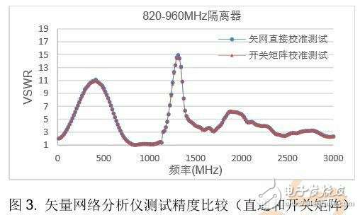 铁氧体器件是窄带微波器件,图3所示的隔离器工作频段为820-960MHz,实测结果显示在不同频段内以及不同驻波值,采用网络分析仪直接测试和通过开关矩阵测试的结果吻合度很高。
