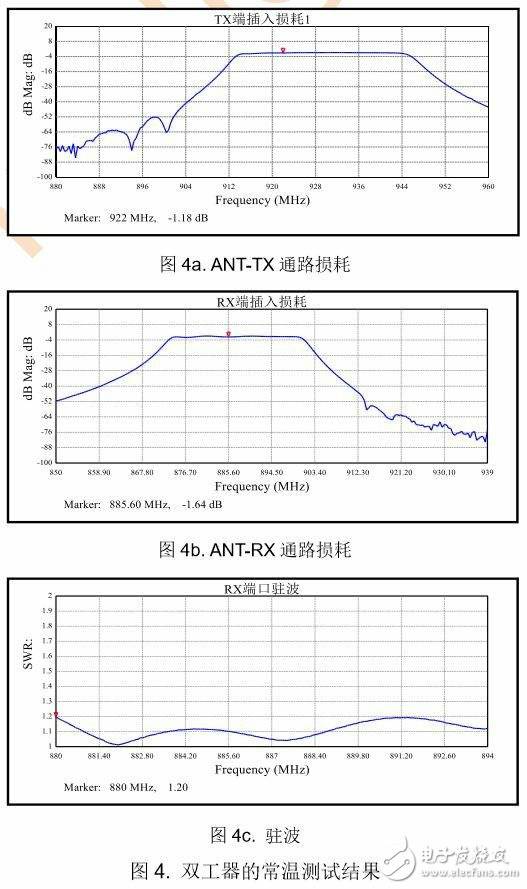 采用图2的自动化测试系统,完成校准、测试条件设置后,测试一只双工器只要花费几秒钟时间,这样一天可以完成200-300只双工器的测试,相比两端口网络分析仪直接测量法,测试效率至少提高了五倍。
